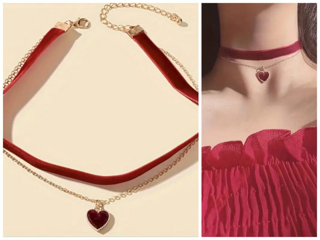 Collar Choker de terciopelo Burdeos doble capa con colgante corazón cantidad